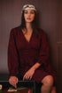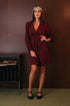 Abito corto bordeaux a manica lunga, scollo a V , elastico posteriore in vita. Motivo ricamato tono su tono.