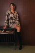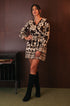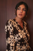 Abito corto a fantasia boho , sfondo color caffè, manica lunga, scollo incrociato con bottoncino a scomparsa. Elastico in vita.