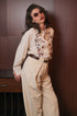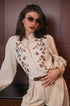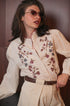 Il pezzo forte di questa camicia è il ricamo floreale a punto croce che decora la parte superiore. Con fili nei toni del blu, bordeaux e beige, il motivo crea un contrasto delicato e sofisticato sul tessuto chiaro. La scelta di questo tipo di ricamo aggiunge un tocco artigianale e vintage, rendendo ogni camicia un pezzo unico. Il colletto alla coreana con bordo ricamato e le maniche leggermente a sbuffo con polsino stretto aggiungono ulteriori dettagli che completano il look.