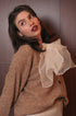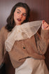Come mostrato nella foto, il cardigan si abbina magnificamente con una gonna beige. Un elemento che aggiunge un tocco di romanticismo è il fiocco in chiffon color crema, un accessorio che crea un interessante contrasto di tessuti leggeri e pesanti. Questa combinazione dimostra la versatilità del capo, che può essere adattato a diversi stili. Il fiocco è removibile