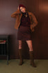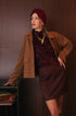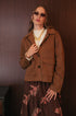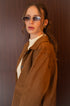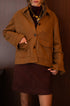 Giacca in eco-camoscio color caramello, due tasche frontali, chiusura con bottoni neri verticali.