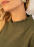 Collo Alto Dettagliato: Il collo, di tipo coreana o leggermente alto (mock neck), è rifinito da un sottile volant in pizzo a smerlo, visibile al bordo.