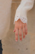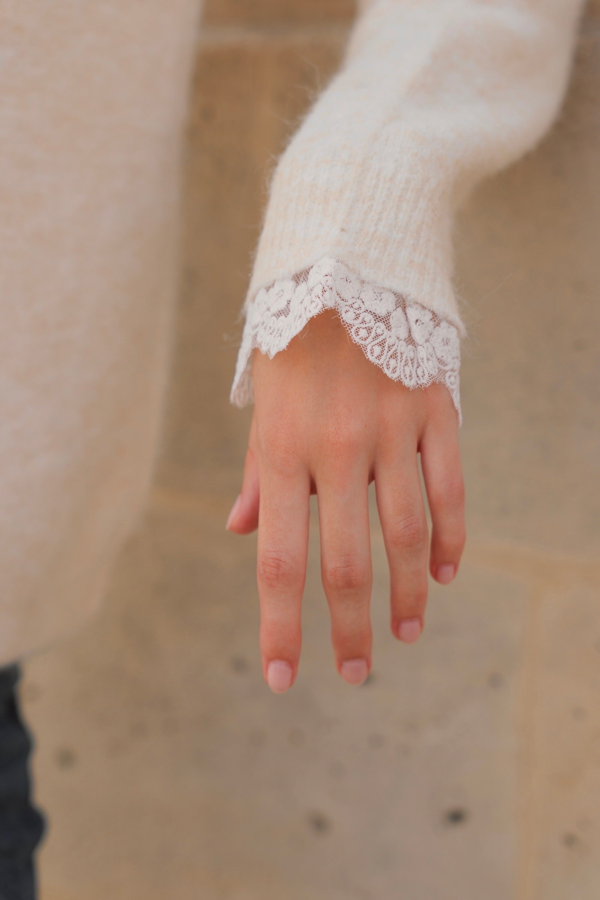 1. Maglione Elegante (Pizzo sul Collo): Indossala con il pizzo sul davanti per creare un sofisticato effetto "sottoveste" che emerge dal girocollo, perfetto sotto una giacca. I polsini sono rifiniti con lo stesso pizzo per un tocco di romanticismo.