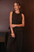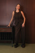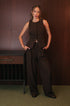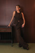 Pantalone palazzo color marrone, vita alta, elastico posteriore in vita, chiusura con zip e bottone. Due tasche alla francese.