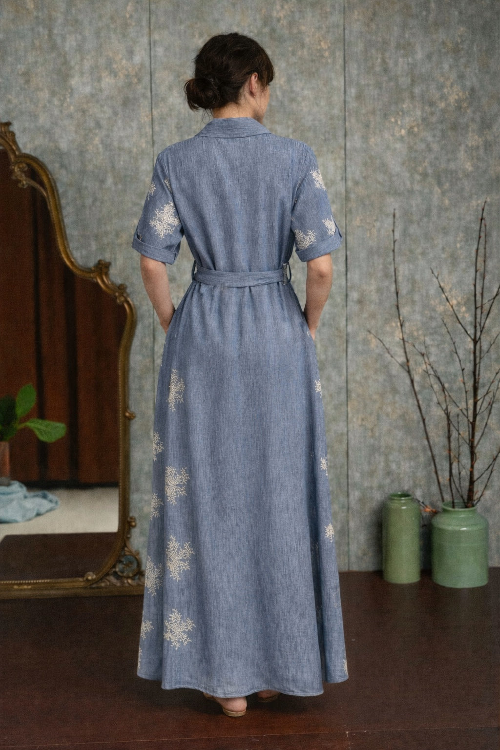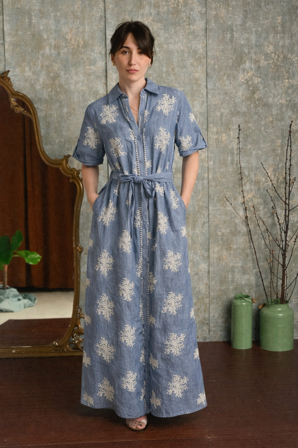 Il design chemisier con bottoni frontali richiama uno stile senza tempo, mentre la cintura in vita regolabile permette di valorizzare la silhouette adattandosi con naturalezza alle forme del corpo. I ricami decorativi all over impreziosiscono il tessuto con un dettaglio delicato che rende l’abito elegante ma facile da indossare ogni giorno.