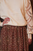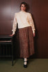 La gonna presenta una lunghezza midi (sotto il ginocchio) e un taglio che cade morbidamente lungo la figura, garantendo una silhouette fluida.