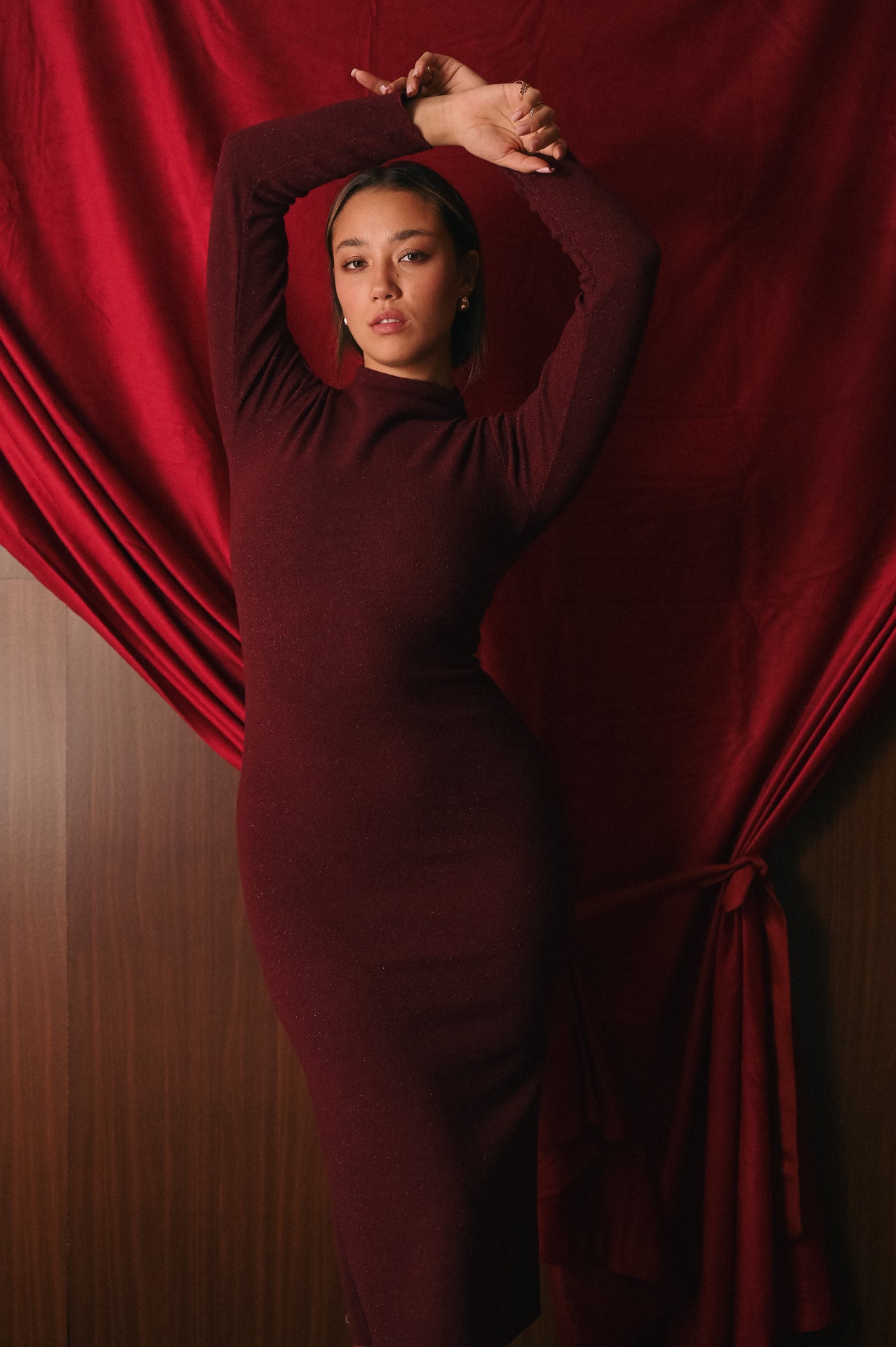 Abito Lungo in Maglia Bordeaux Comfort Avvolgente ed Eleganza Invernale