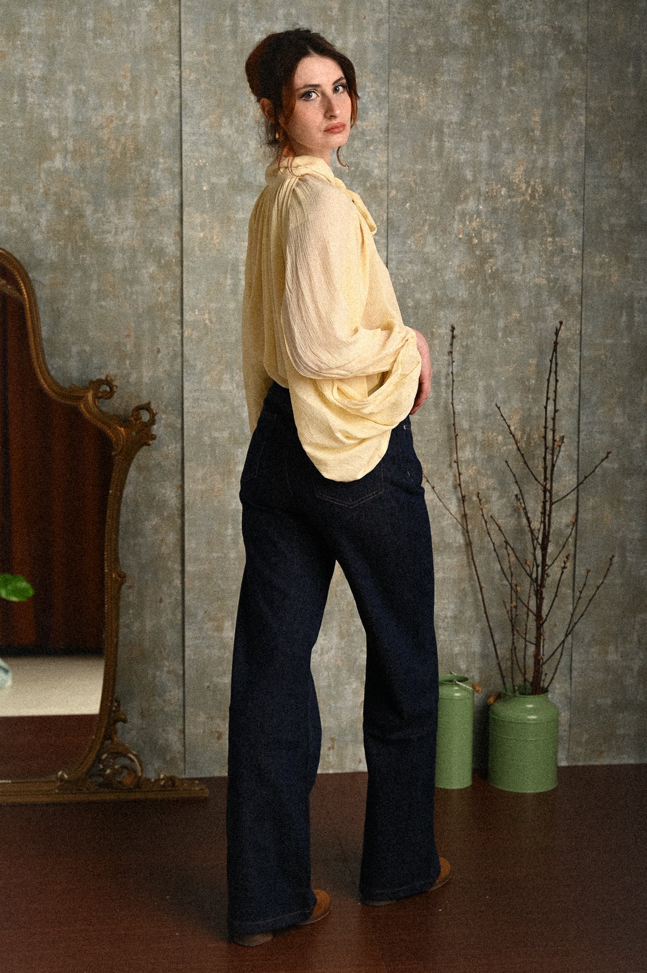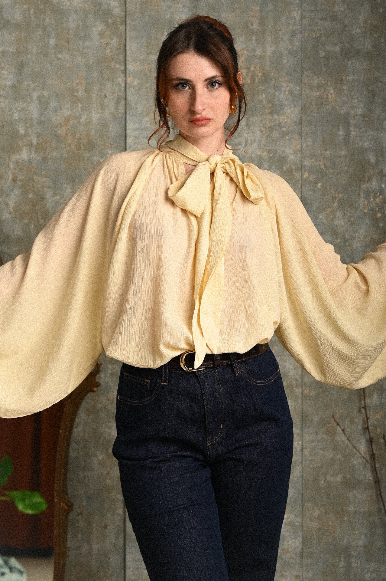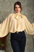 Blusa donna color burro con fiocco al collo e maniche ampie