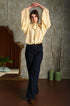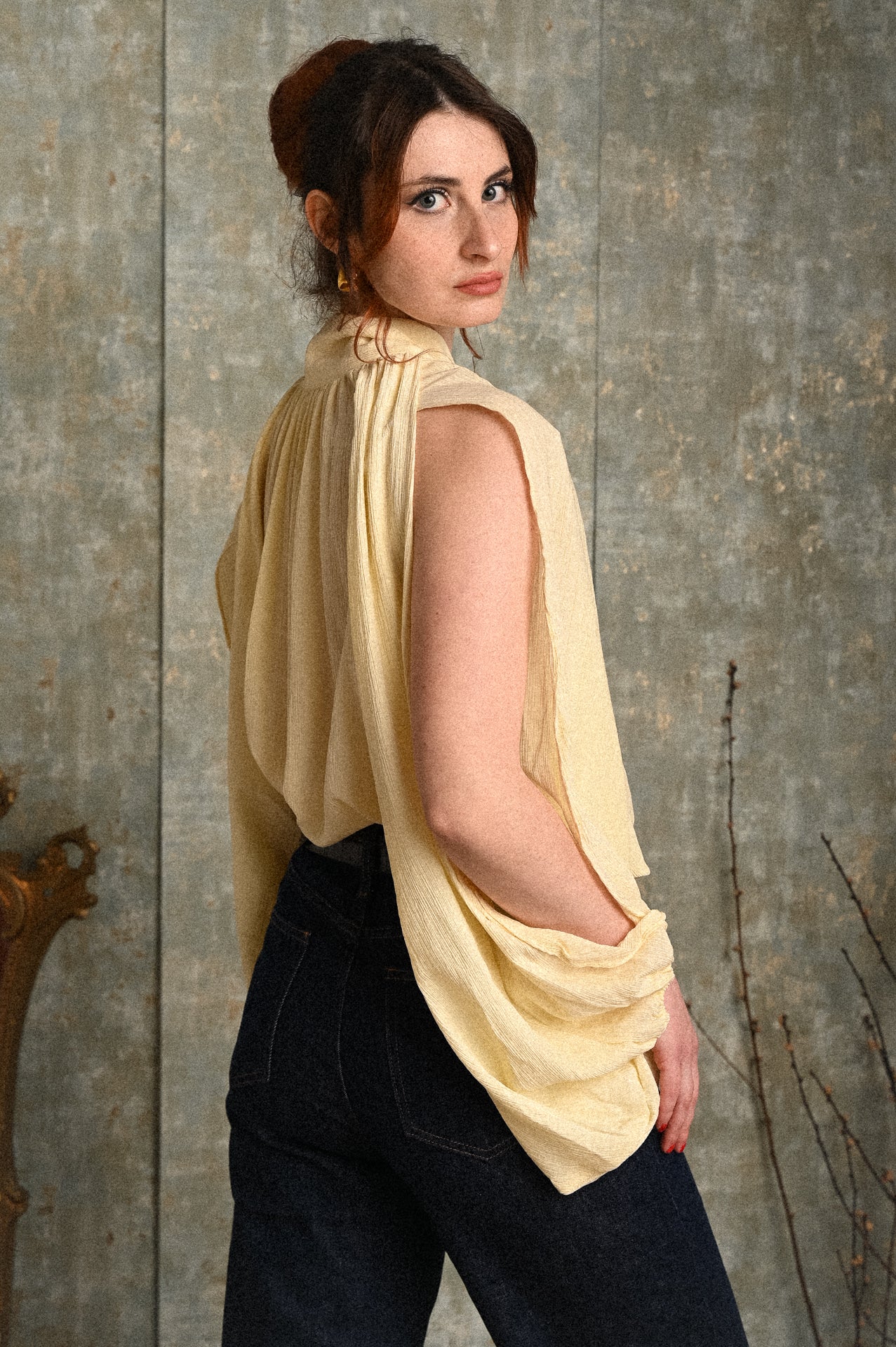 Il dettaglio del fiocco al collo aggiunge un tocco femminile e delicato, mentre le maniche ampie con spacchi donano dinamismo e carattere, rendendo il capo distintivo ma facile da indossare. La tonalità burro, calda e luminosa, si abbina perfettamente a denim, pantaloni sartoriali o gonne fluide.