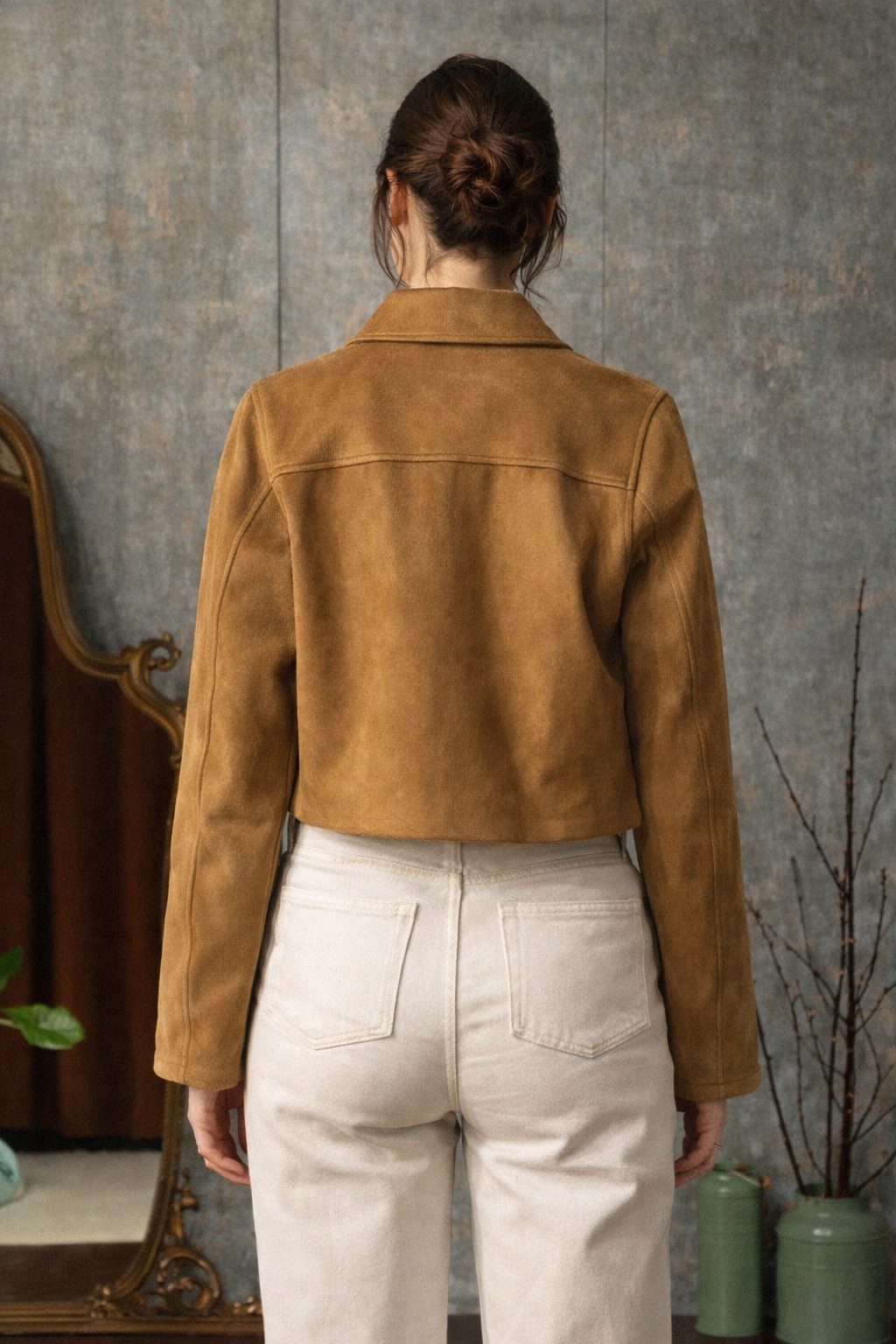 La giacca corta donna effetto camoscio è un capo versatile e raffinato, perfetto per completare con stile i look di mezza stagione. Il tessuto effetto camoscio dona alla giacca una texture morbida e vellutata, creando un effetto elegante e contemporaneo ideale per outfit casual chic.