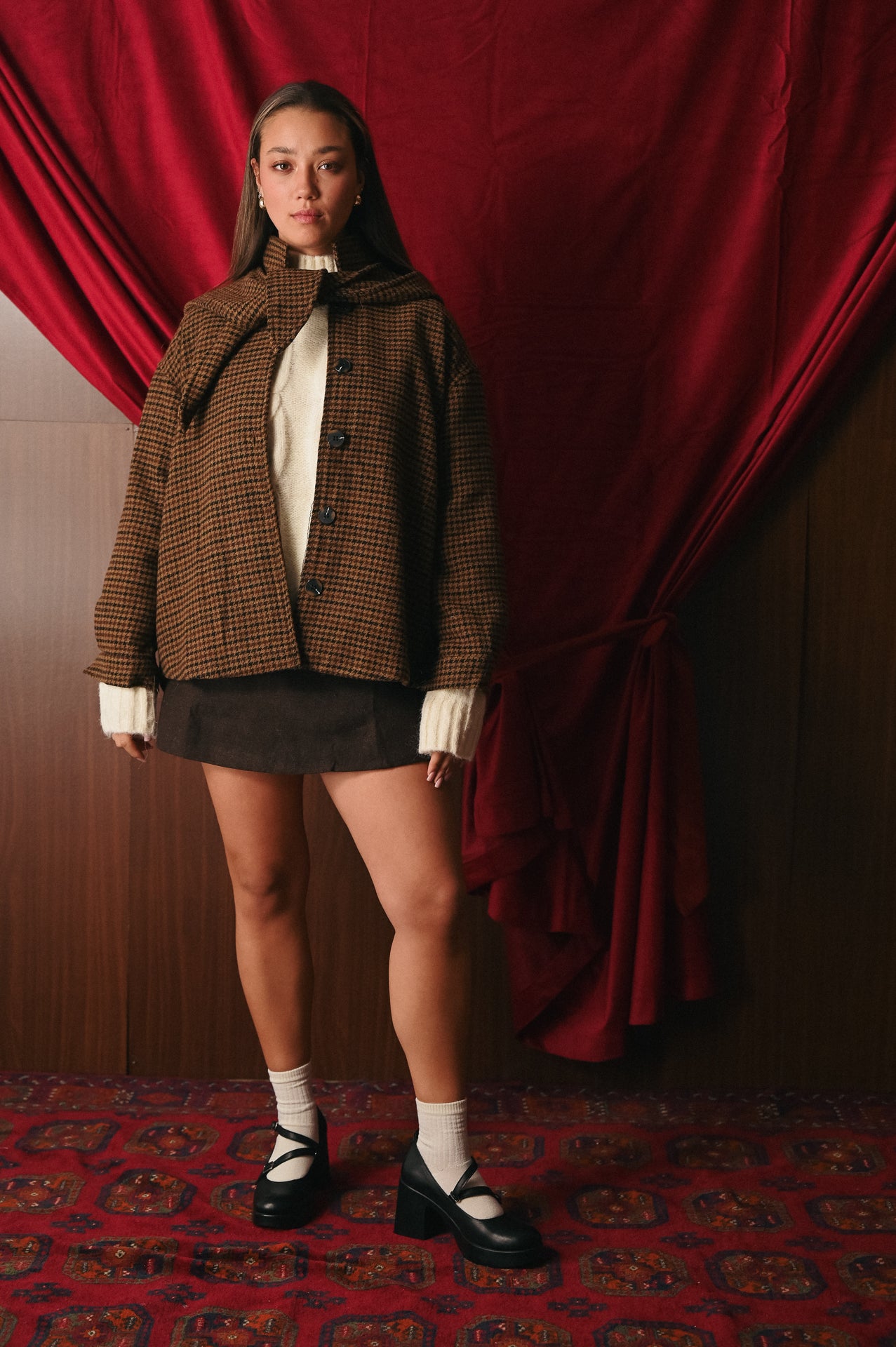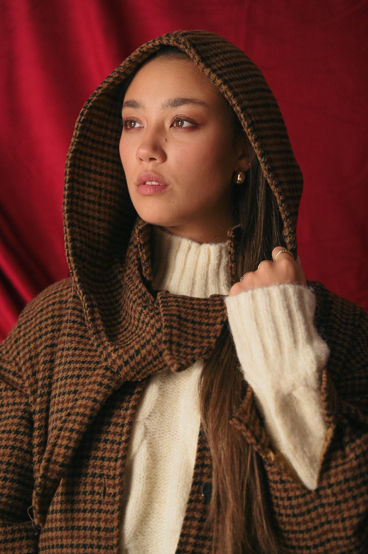 Questo Giacchino Corto con Cappuccio unisce una silhouette moderna e di tendenza ad un tessuto classico e caldo. La fantasia Pied de Poule (o Houndstooth) nei toni caldi del Marrone e del Nero è l'ideale per le tue strategie social e campagne fotografiche che richiamano lo stile universitario e vintage-chic.