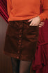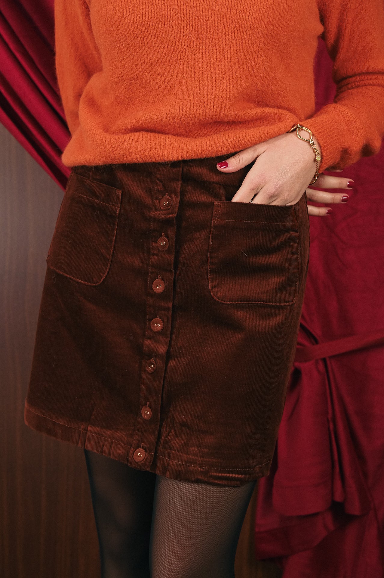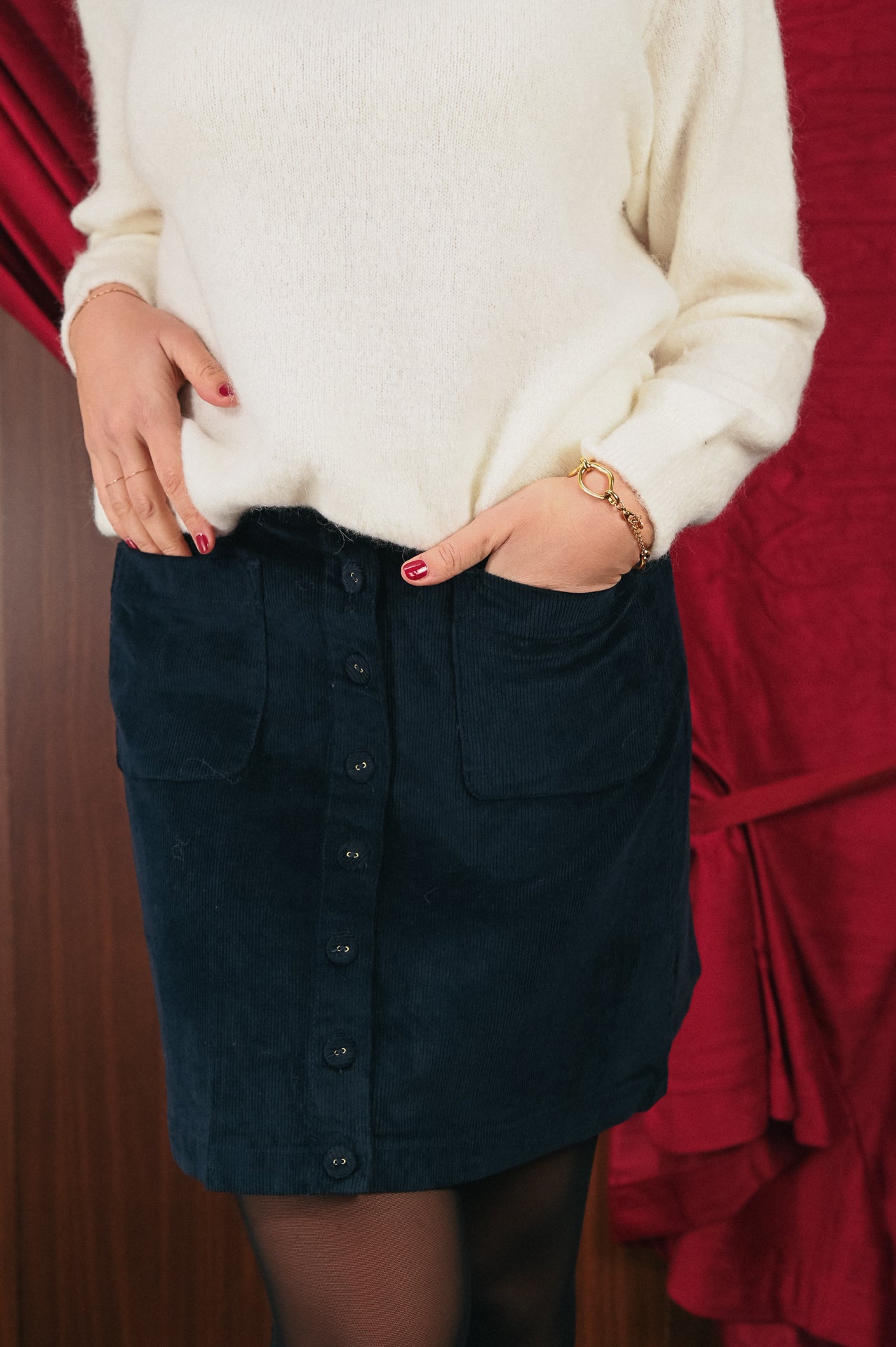 Gonna corta in color blu a motivo costine sottili, chiusura con bottoni verticali , due tasche frontali .