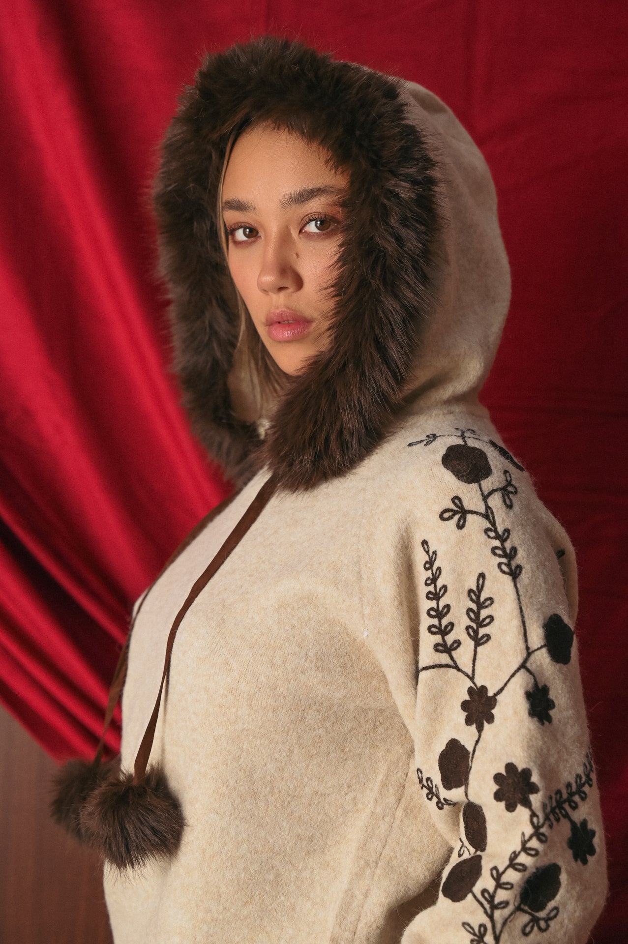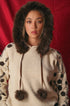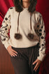 Dettagli Giocosi: Il maglione è impreziosito da ricami (probabilmente floreali, geometrici o di ispirazione nordica) e da pom pom (spesso applicati ai lacci del cappuccio o sul corpo del maglione), che conferiscono un aspetto divertente e artigianale.