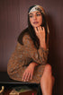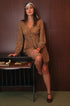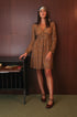 Abito corto color mostarda a fantasia, scollo a V , manica lunga, elastico posteriore in vita. Velina interna