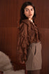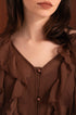 Blusa dal gusto femminile e raffinato, caratterizzata da uno scollo a V che valorizza il décolleté e da delicati volant applicati sul davanti e lungo le spalle. Il colore marrone caldo la rende estremamente versatile, perfetta sia per look quotidiani curati sia per abbinamenti più eleganti. Il tessuto leggero in poliestere dona fluidità al capo e una vestibilità confortevole per tutta la giornata.