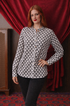 Camicia bianca a fantasia fiori neri, colletto coreano , chiusura con bottoni e dettagli merlettati sul busto.