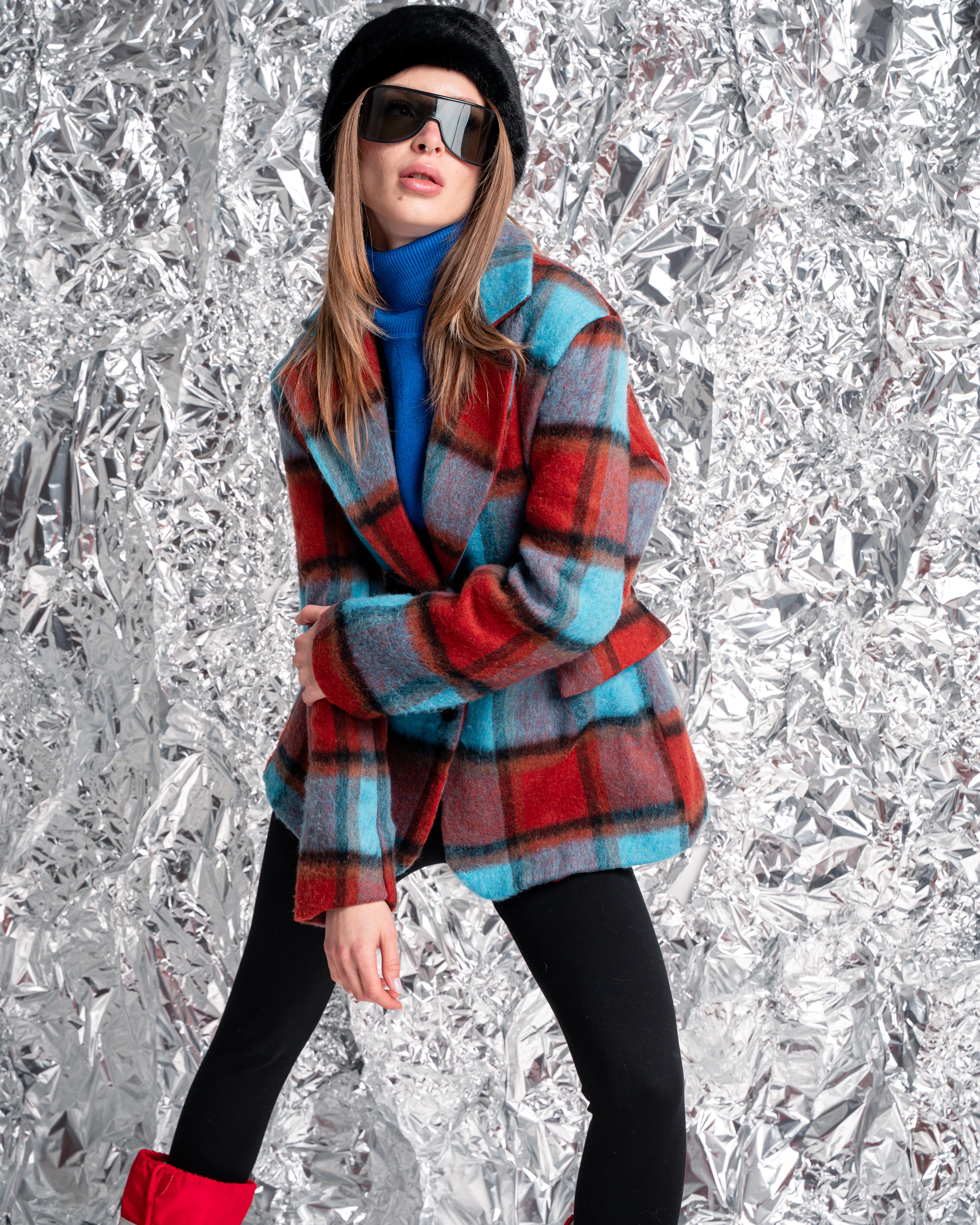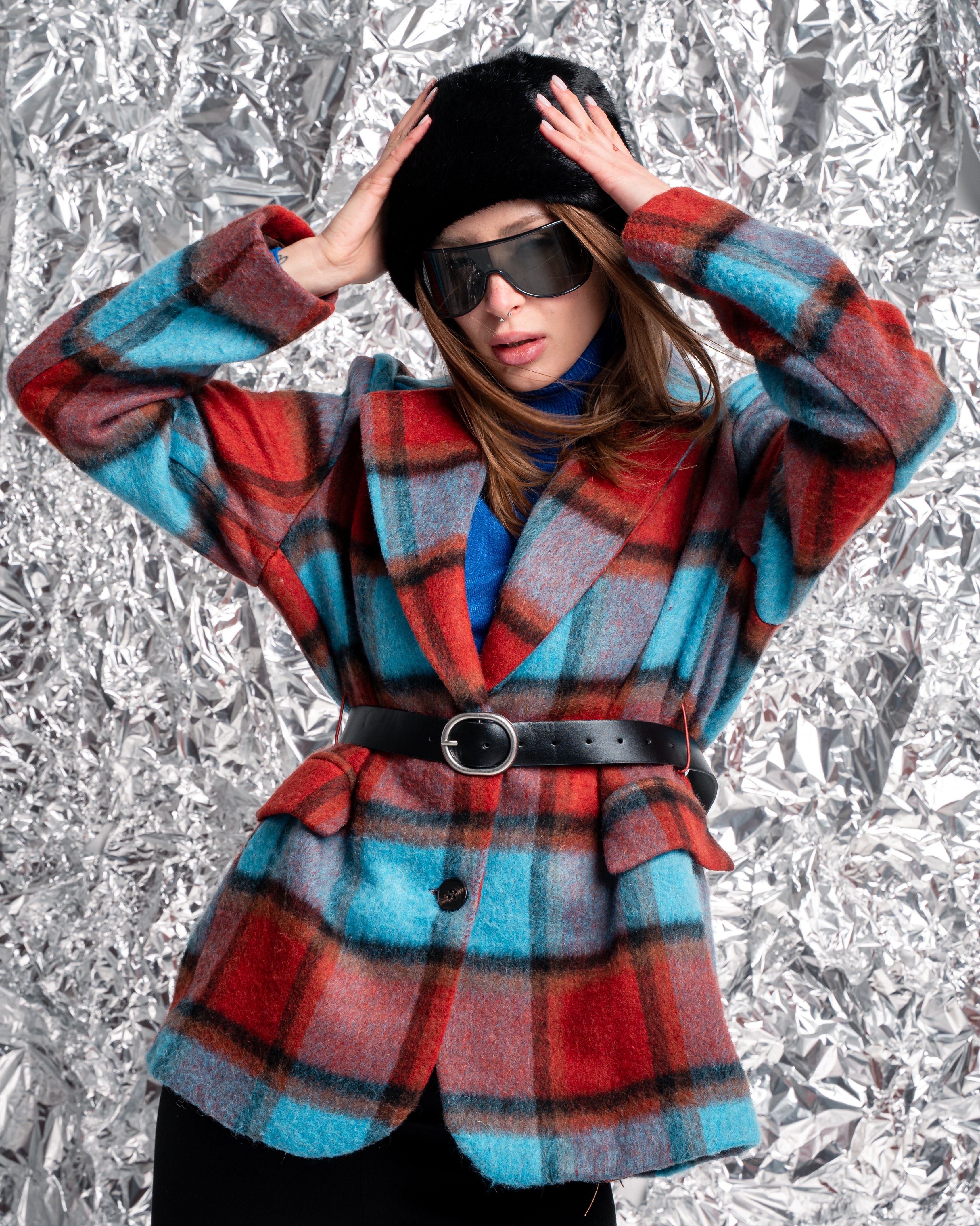 Cappotto corto da donna caratterizzato da una fantasia a quadri multicolor nei toni del rosso, azzurro e nero, dal forte impatto visivo ma equilibrato. Il taglio sartoriale leggermente over valorizza la silhouette mantenendo una vestibilità moderna e confortevole, mentre la cintura in vita permette di modulare il volume, segnando il punto vita o lasciandolo più morbido. Dotato di velina interna per una migliore struttura e comfort, presenta chiusura frontale con bottoni e tasche applicate che richiamano lo stile coat tailoring contemporaneo. Un cappotto distintivo, ideale per dare carattere anche agli outfit più essenziali.