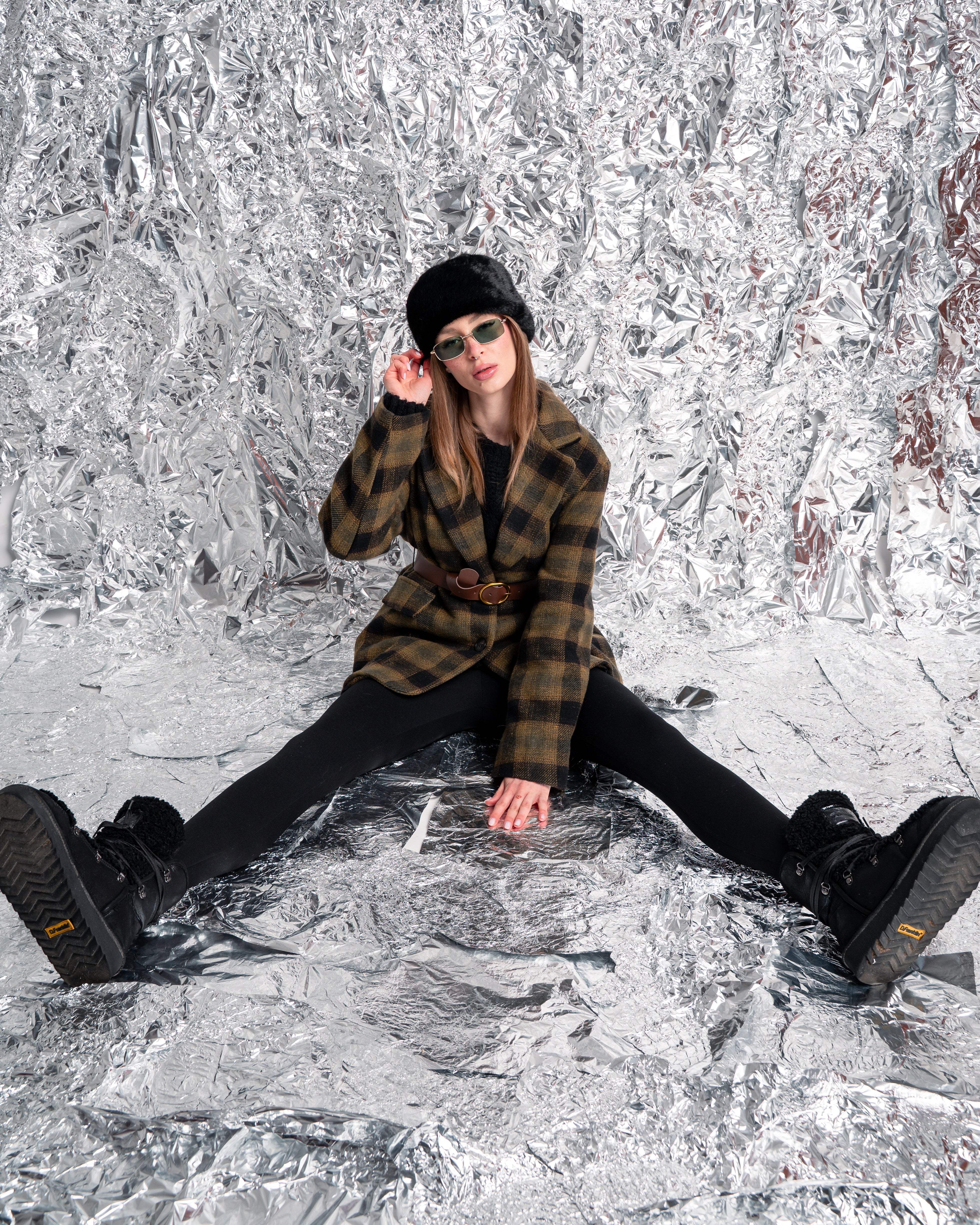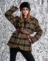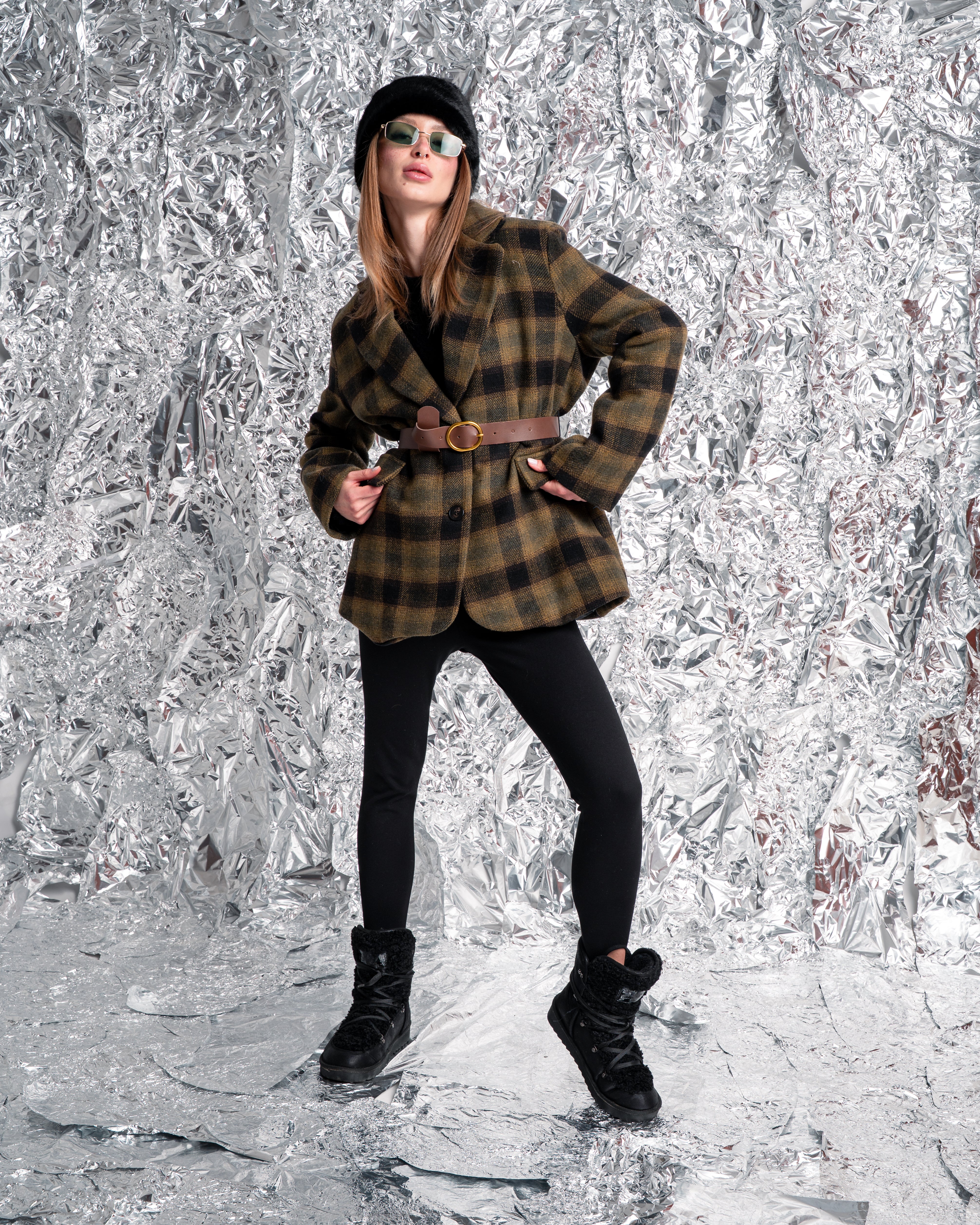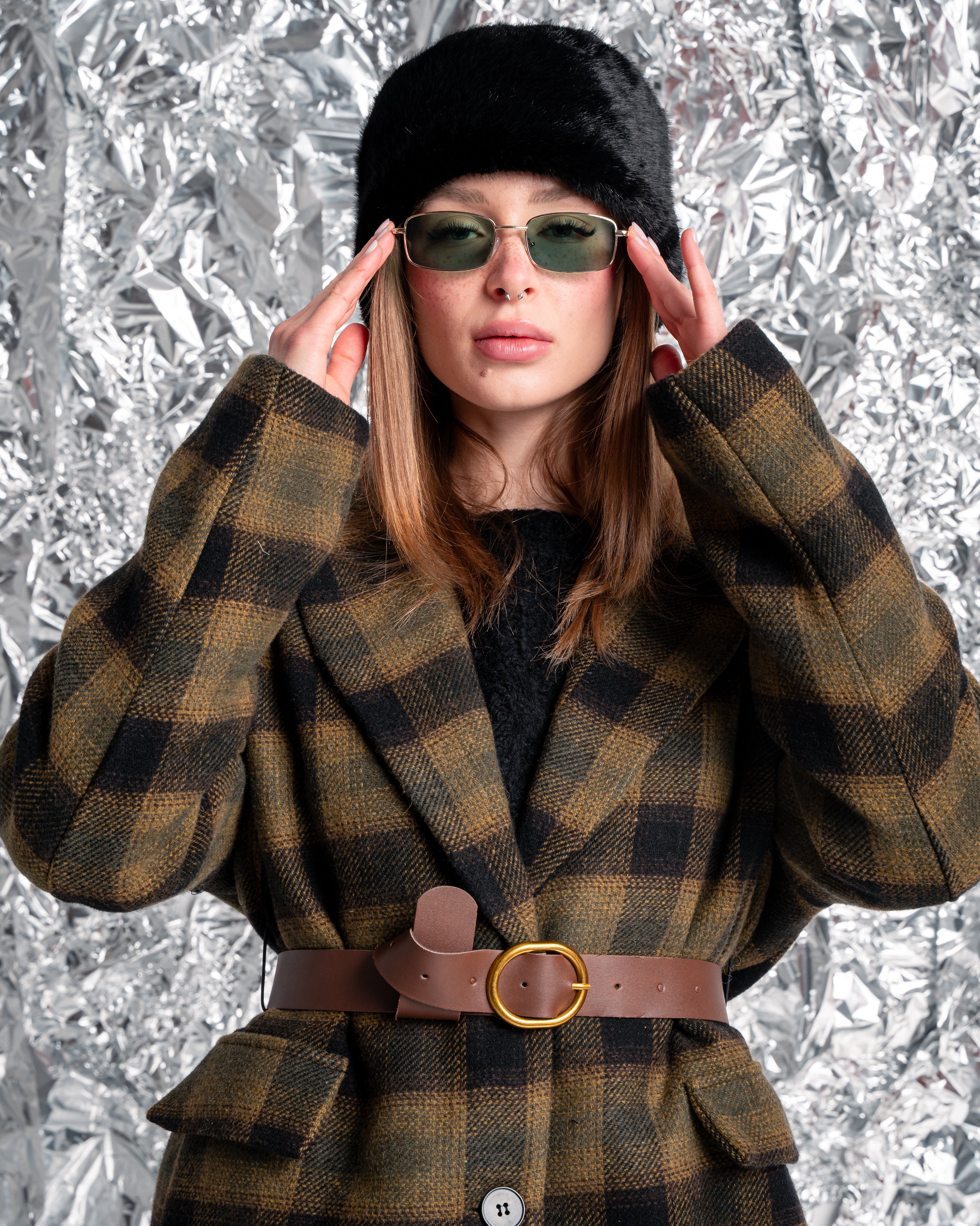 Cappotto corto da donna caratterizzato da una fantasia a quadri multicolor nei toni del verde e nero, dal forte impatto visivo ma equilibrato. Il taglio sartoriale leggermente over valorizza la silhouette mantenendo una vestibilità moderna e confortevole, mentre la cintura in vita permette di modulare il volume, segnando il punto vita o lasciandolo più morbido. Dotato di velina interna per una migliore struttura e comfort, presenta chiusura frontale con bottoni e tasche applicate che richiamano lo stile coat tailoring contemporaneo. Un cappotto distintivo, ideale per dare carattere anche agli outfit più essenziali.