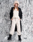 Cappotto nero ispirato al classico trench, reinterpretato con una linea pulita ed essenziale dal gusto contemporaneo. La struttura è valorizzata dalla velina interna, che dona comfort e una vestibilità ordinata, mantenendo il capo leggero ma strutturato.