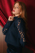 Maglione Blu Notte con Maniche in Macramè: Calore e Trasparenza Glamour