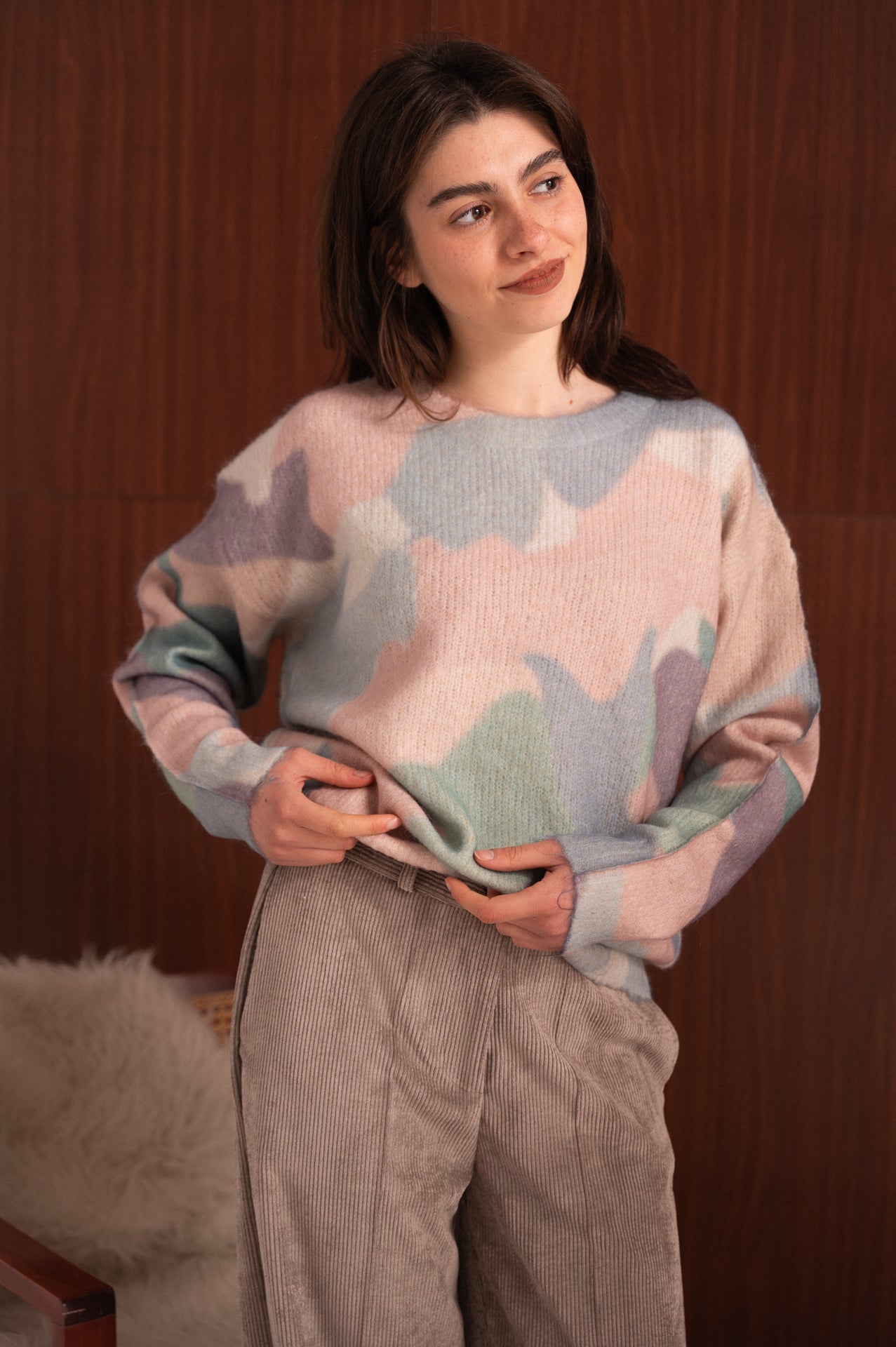 Maglione dal carattere morbido e contemporaneo, valorizzato da una fantasia astratta nei toni pastello che richiama un’estetica artistica e delicata. Il disegno fluido crea movimento e profondità, rendendo il capo protagonista del look senza risultare eccessivo. La linea è essenziale e confortevole, pensata per accompagnare la silhouette con naturalezza. Il mix di filati garantisce una mano soffice, una buona resistenza e una leggera elasticità, assicurando comfort durante tutta la giornata. Perfetto da abbinare a pantaloni sartoriali, denim o gonne per outfit casual chic curati e luminosi.