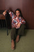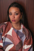 È caratterizzato da un'elaborata fantasia astratta in stile bohémien, che domina l'intero capo. La palette di colori è ricca e armoniosa, con tonalità di vIola, Bordeaux, e aranciosu uno sfondo crema chiaro.