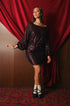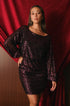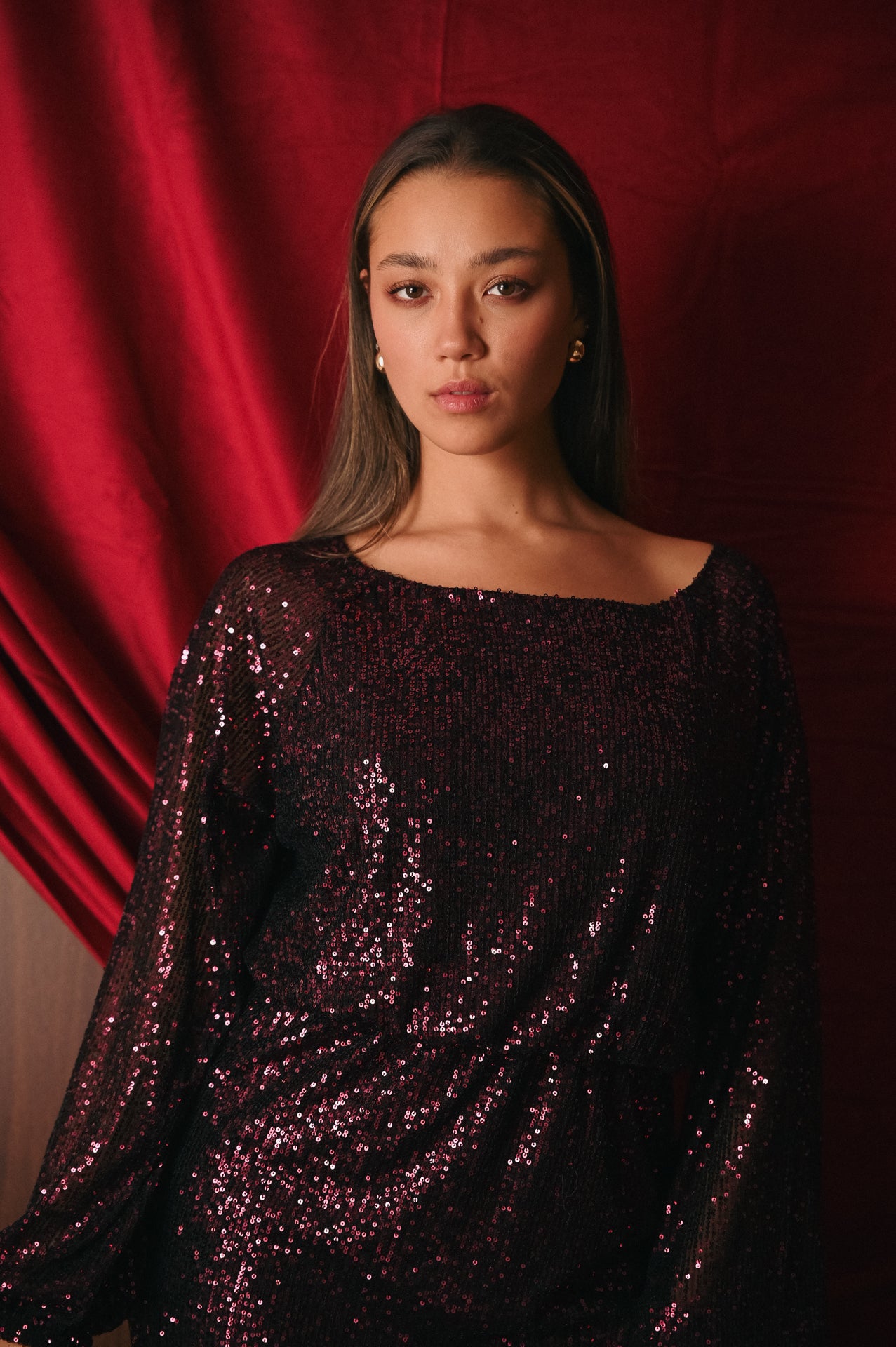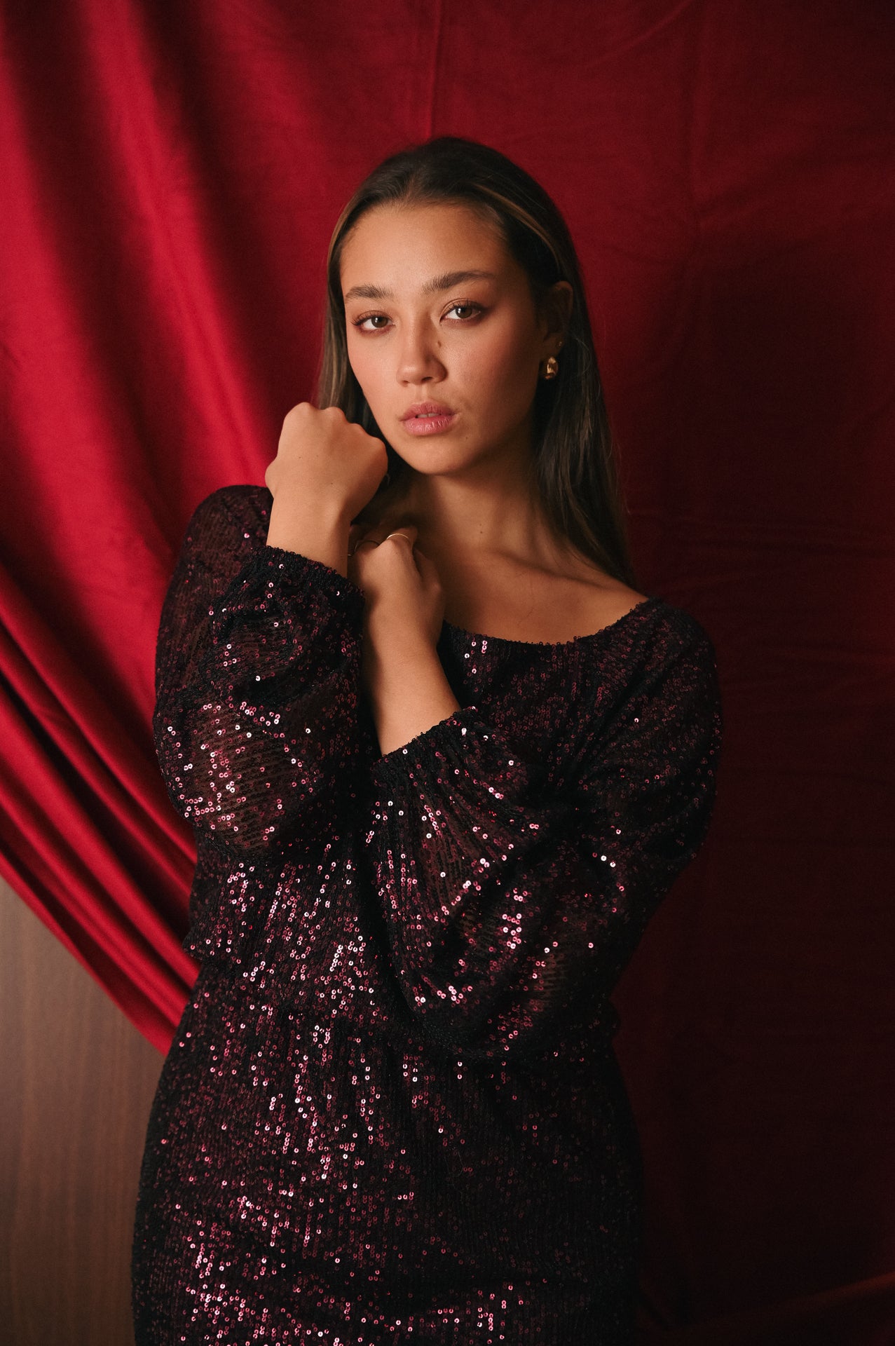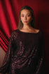 • Paillettes Seducenti: L'abito è ricoperto da una fitta trama di paillettes colore Viola, un colore audace che incarna l'eleganza e la creatività.