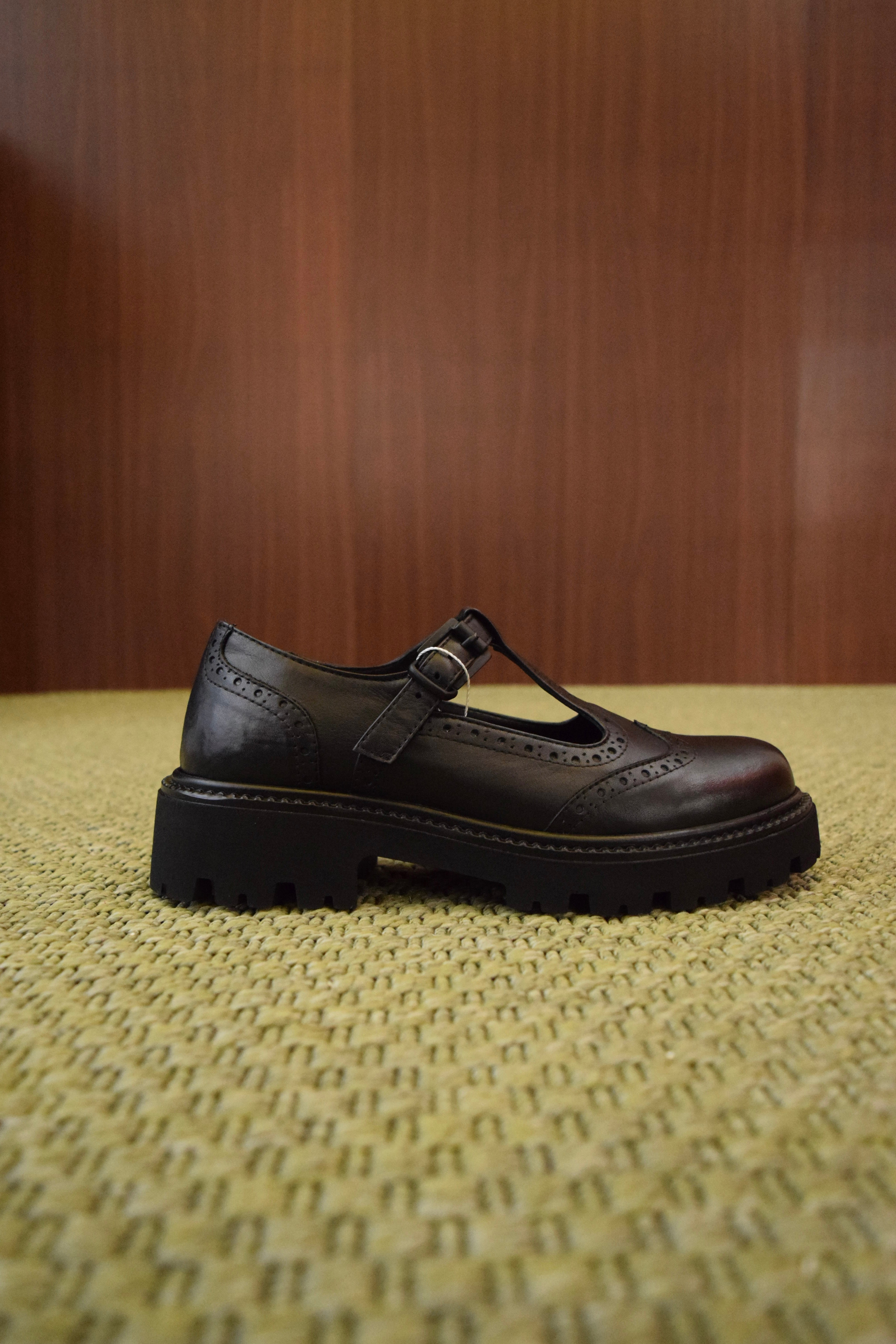 Scarpe Donna T-Bar in Pelle nera brogue con Suola Carrarmato Chunky